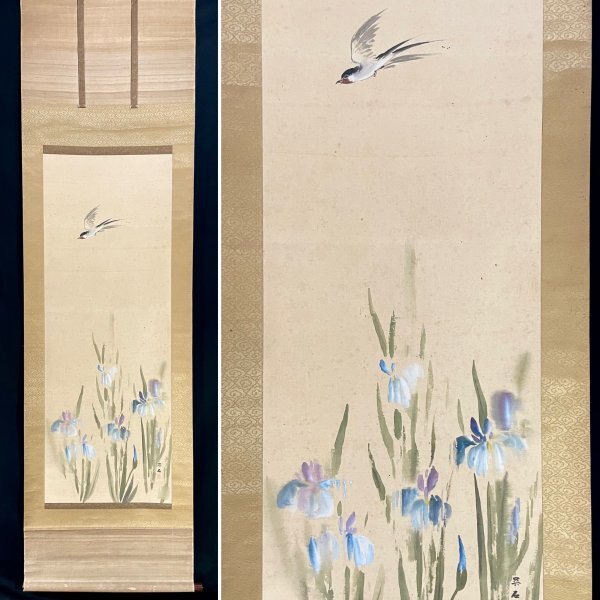 - S1071m[模写]呉石「菖蒲燕図」掛軸 絹本 花鳥図 鳥獣 日本画 絵画 日本美術