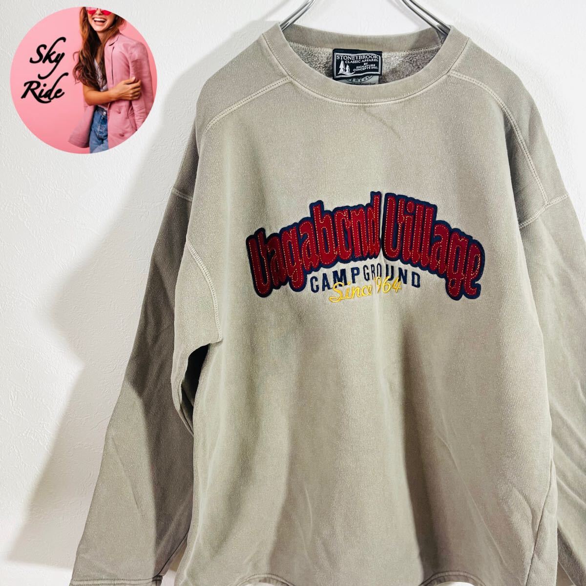 > STONEYBROOK ストーニーブルック メンズ ヴィンテージ キャンプグラウンド 英字 ビッグ刺繍 プルオーバースウェット グレー L 古着 #TB0990