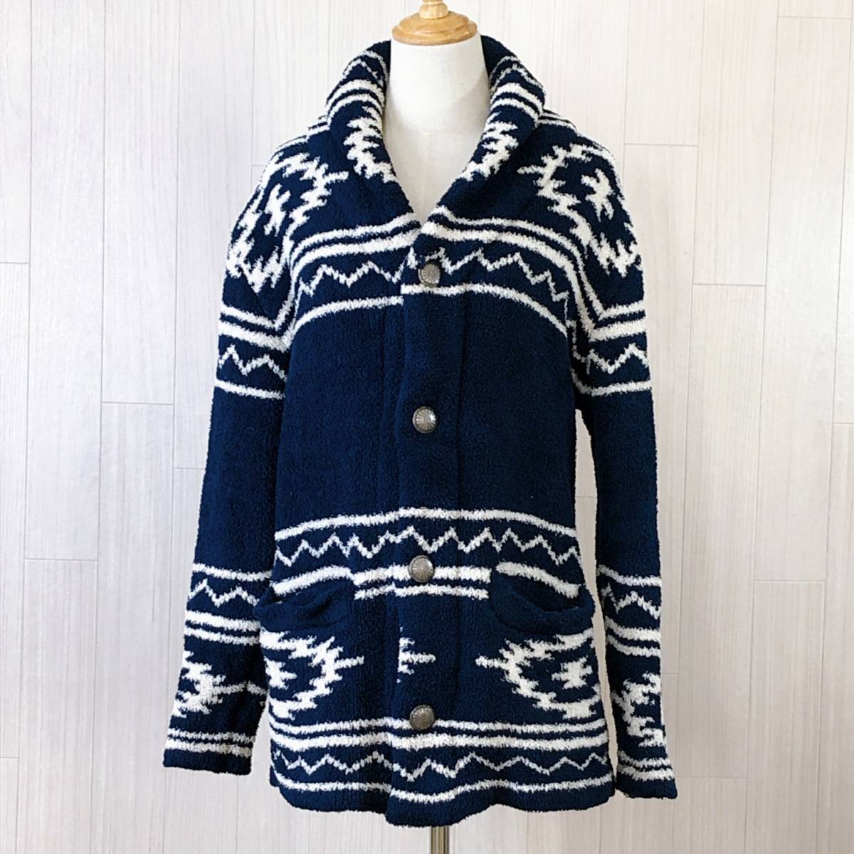 > YZ0428 Denifits デニフィッツ Avail レディース アウター カーディガン 長袖 厚手 Lサイズ ネイビー紺 ホワイト白 総柄 あたたか シンプル