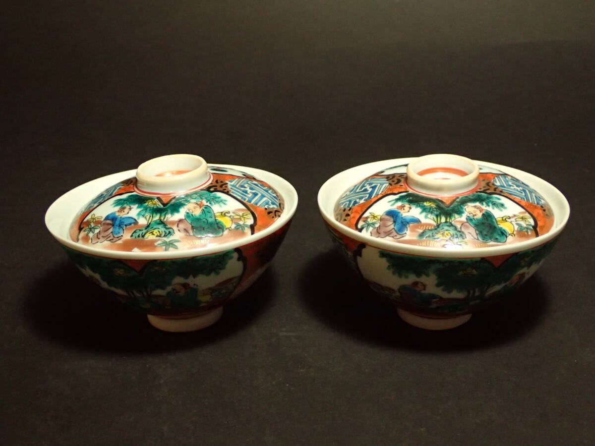 - S-95 九谷 庄三作 在銘 錦絵 蓋付 茶碗 11.2cmX7.0cm