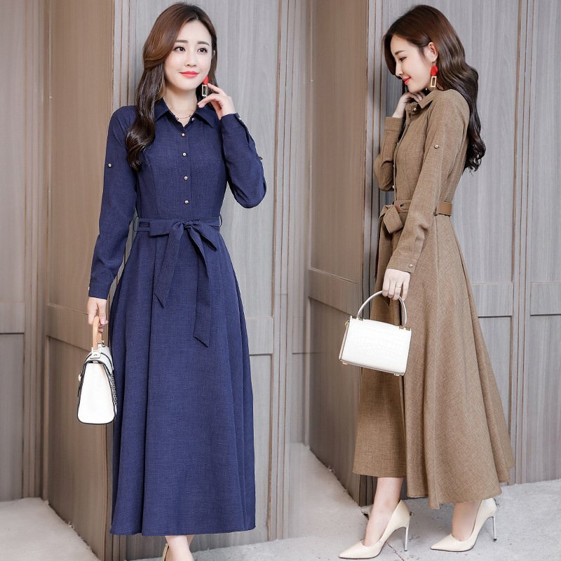- 新品 ワンピース レディース 秋 マキシ丈ワンピース きれいめ シャツワンピース ロング丈 ウエストリボン 長袖 ネイビー DYL321