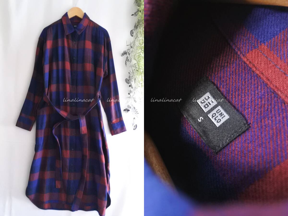> 未使用 ユニクロ* フランネル シャツワンピース ゆったりS Dネイビー×Dレッド ウエストリボン タグ無しです