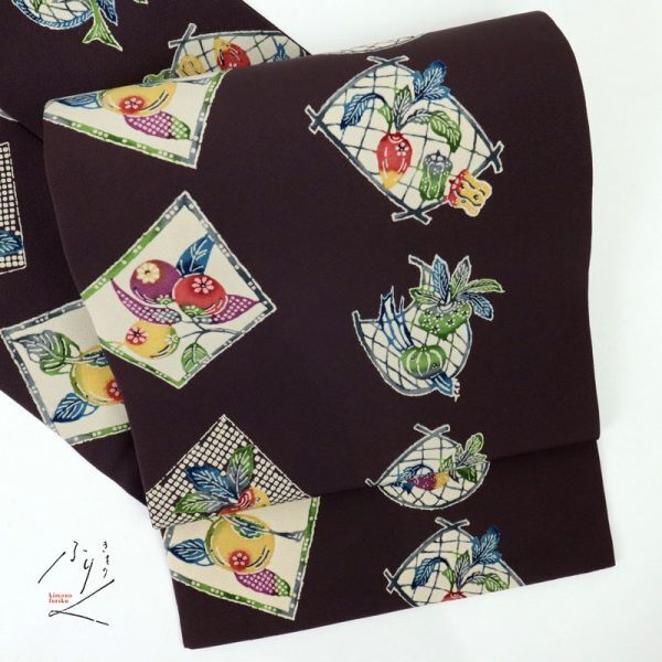 > 【名古屋帯】 特選 逸品 お野菜型 染模様 名古屋帯 黒鳶色 ちりめん地 正絹 着物 NP9-17