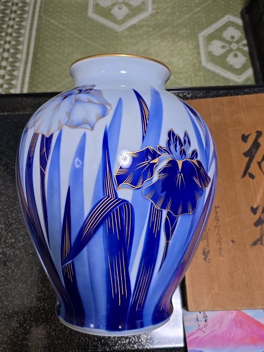 - 深川製磁 宮内庁御用達 花瓶 花入深川製陶印いり木箱いり青と白の陶器製花瓶