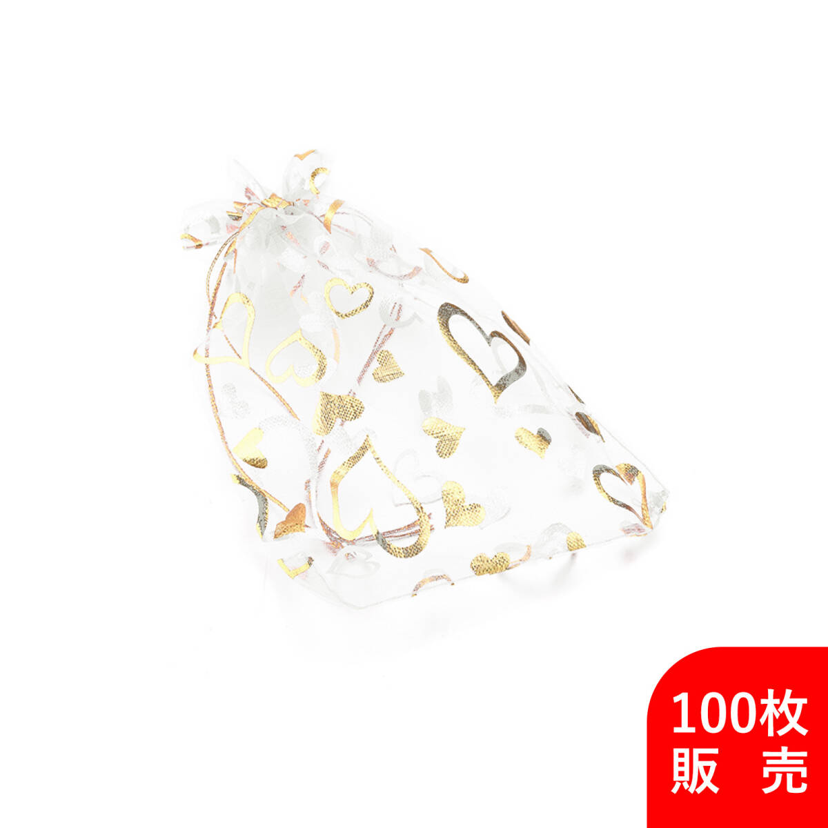 - 【100枚セット】透明糸巾着袋 ハートオーガンザバッグ ゴールドハート型プリント ジュエリーバッグ ギフトパック 化粧品 小物収納;J4225;