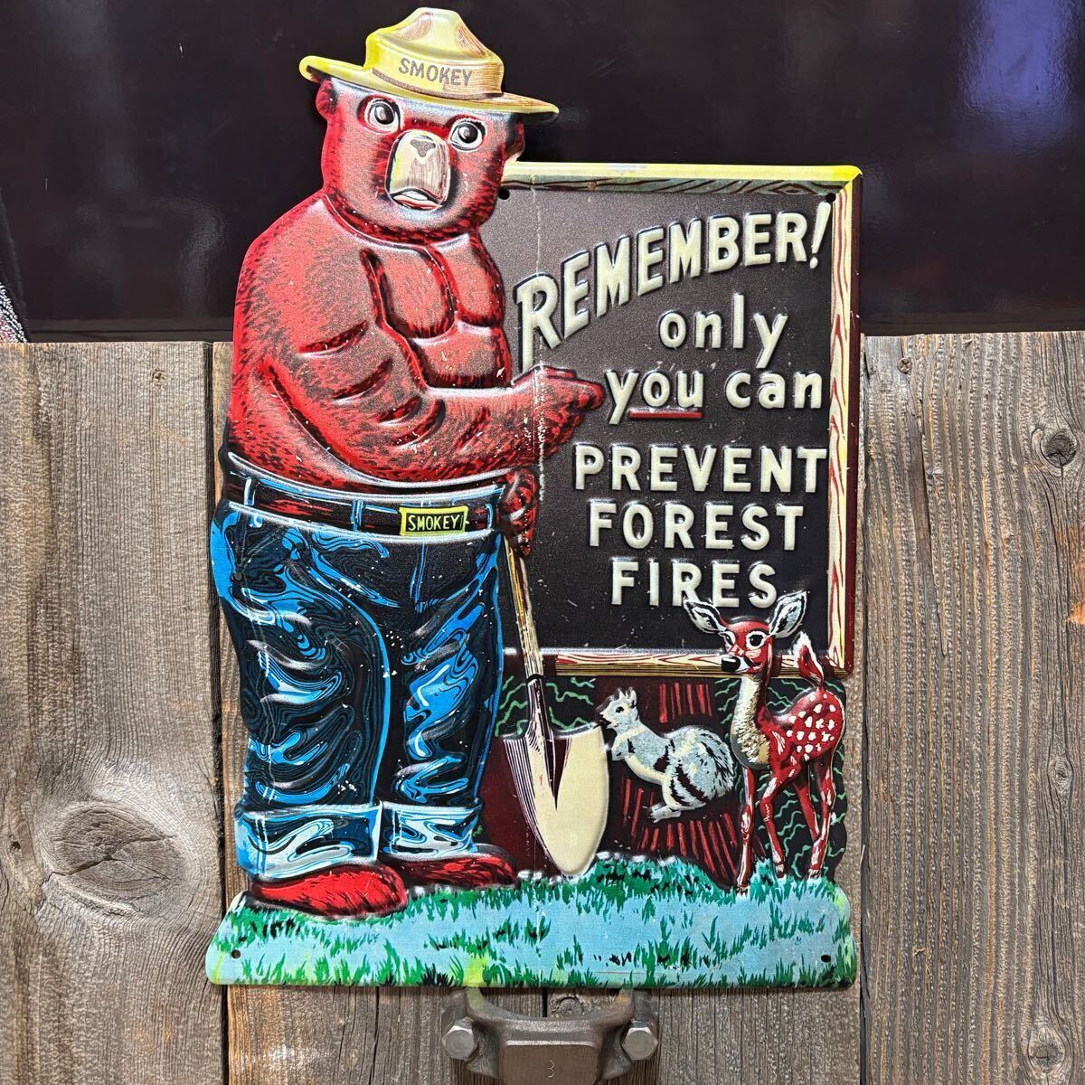 - 新品アメリカ製スモーキーベア エンボス看板 山火事防止 警告看板 検)ブリキ看板 インテリア アメリカン雑貨フォレストサービス森林局USA2