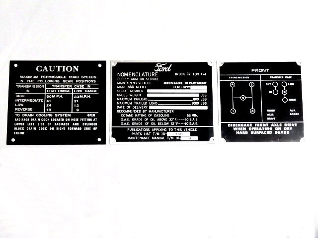 - フォード トラック 1/4トン 4×4 GPW ミリタリー ジープ プレート 3枚セット Jeep ジープ Ford MB 希少 レア 未使用 美品
