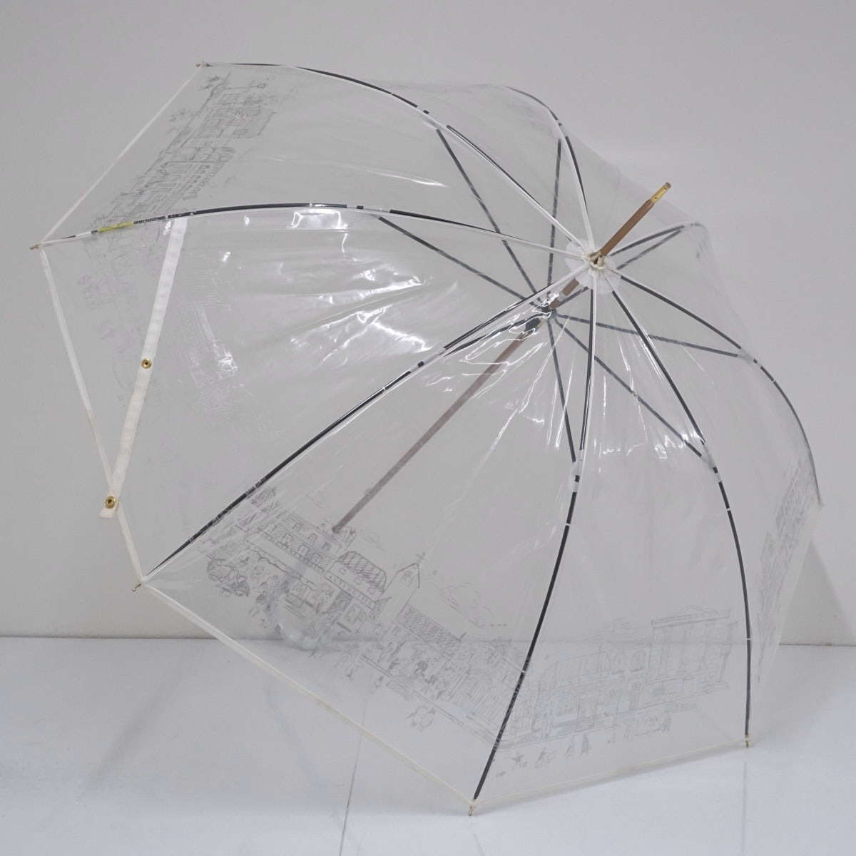 > 高級ビニール傘 HANWAY ハンウェイ USED美品 ホワイト パイピング 街並み 55cm S1992