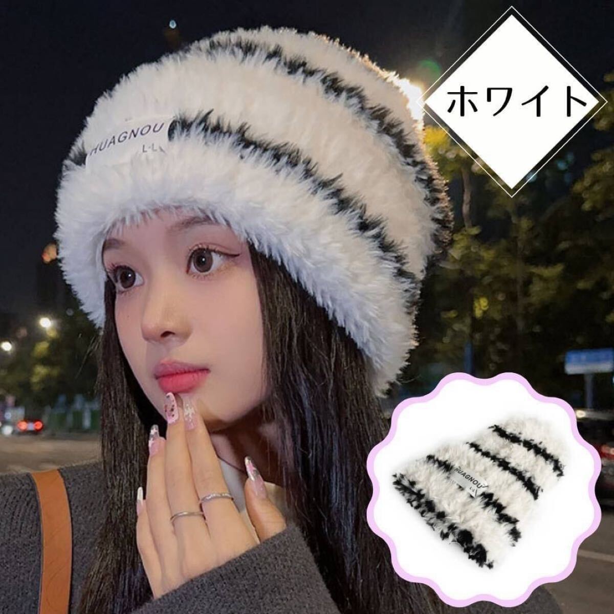 - ふわふわ ファー帽子 ニット帽 ボーダー ホワイト レディース 帽子 秋冬 防寒