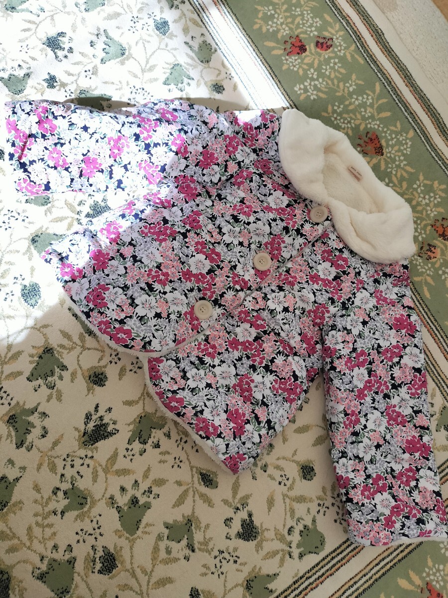 > 新品 プティマインpetit main 中綿花柄白ボア付きコート 定価10000 110 クリスマスプレゼントにも お姫様みたい