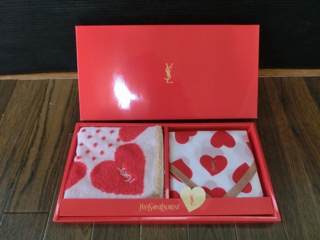 > ♪♪【6L9⑤f】YSL イヴサンローラン タオル&ハンカチ2枚 赤×白ハート ギフト 箱付き 未使用♪♪