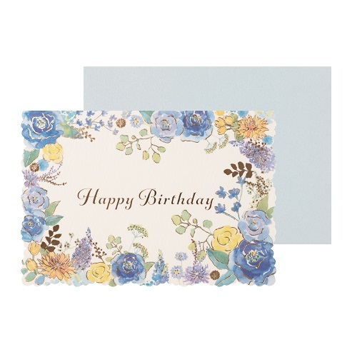 > @【即決】▽バースデーカード フラワーブルー▽ TSUTSUMU メッセージカード 誕生日 封筒付き お花 水彩 金箔 ボタニカル // TC081