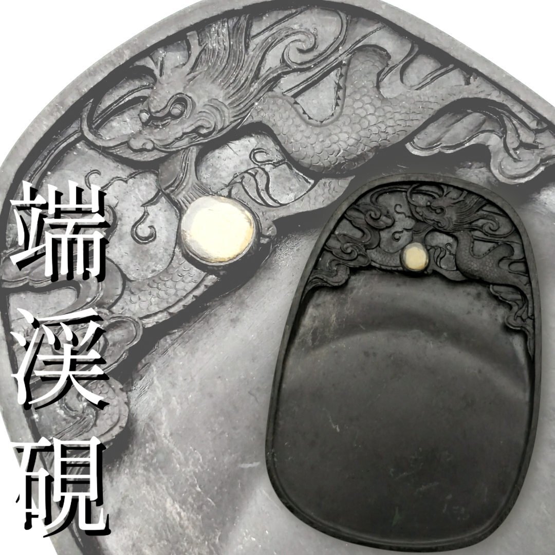 - 端渓硯 飛龍石目端渓名硯 雲龍紋 威龍彩雲 唐木硯箱付 名硯 雲龍硯 天然硯 石眼 中国美術 骨董 古物 古硯 書道具 文房四宝 硯【60n794】