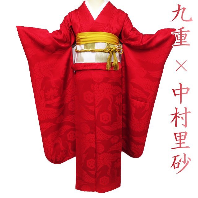 > 振袖 着物 中古 正絹 成人式 結婚式 結納 九重 中村里砂 地模様 鶴 花模様 赤色 身丈161cm 裄63cm M きもの北條 A1128-6