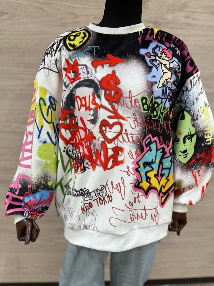 - Y.e(J)ow イエロージェイ Wフェイスベロアクル-ネックSW 白 Lサイズ 144603 アートプリント グラフィックアート ユニセックス