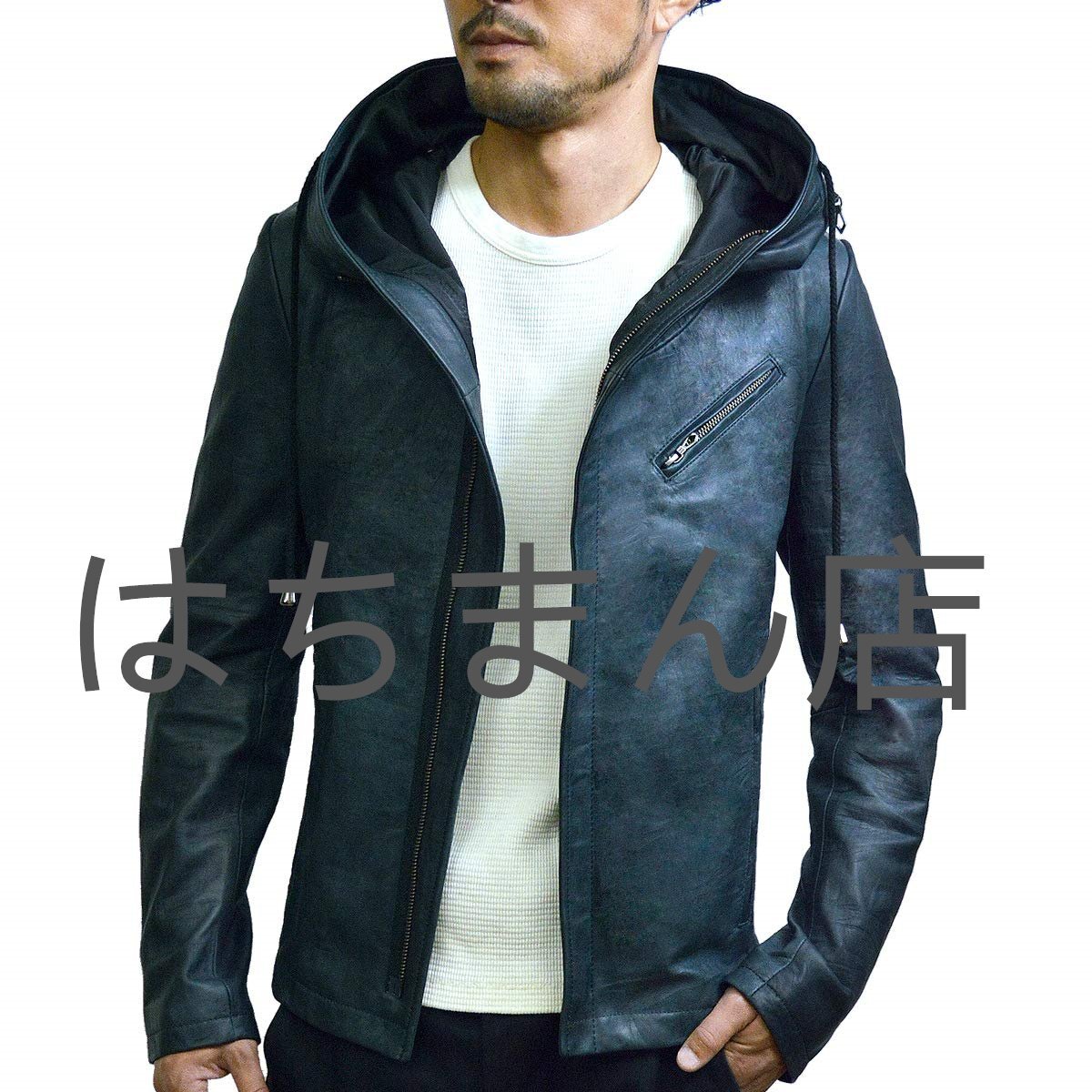 - レザージャケット ライダースジャケット 革ジャン フード付き メンズ 本革 シングルライダースジャケット フード ブルー 青 USA132 S-3XL