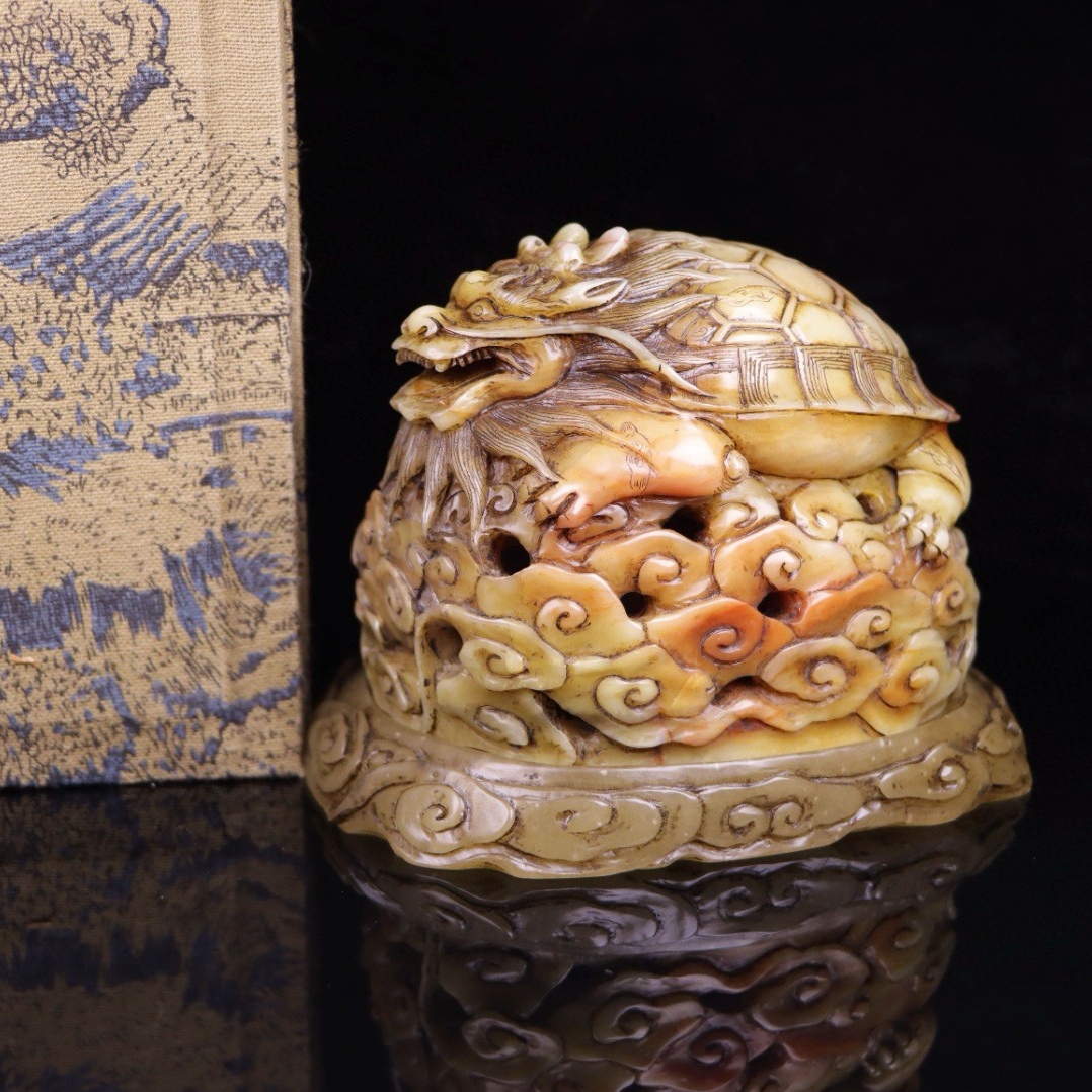 - 旧蔵 清乾隆三十五年内務府監製 寿山石 三色芙蓉石 竜亀香薫 置物 天然石 手彫 篆刻 極細工 希少珍品 古美術 古美味 212-18