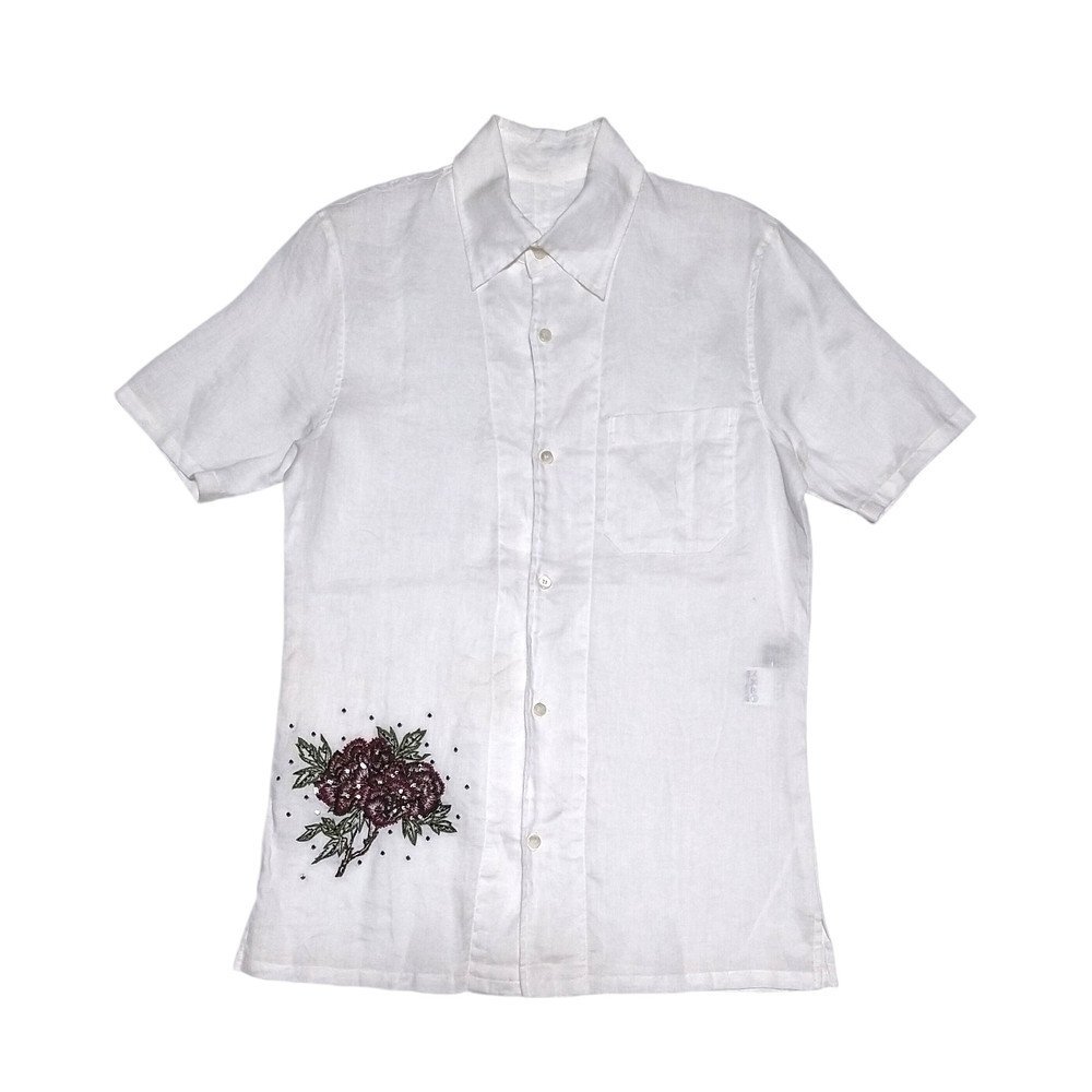 > 新品正規70%OFF KENJI ITO COMME CA COLLECTION コムサコレクション 日本製 半袖シャツ M 白 麻100% 花刺繍 g1901m