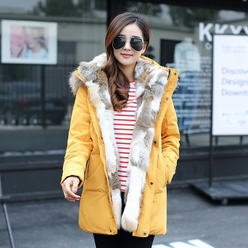 - OHJ1084★新品 ダウンジャケットダウンコート厚手モッズコートリアルファーアンゴラ兎毛カップルロングコートフード取り外す イエロー 4XL