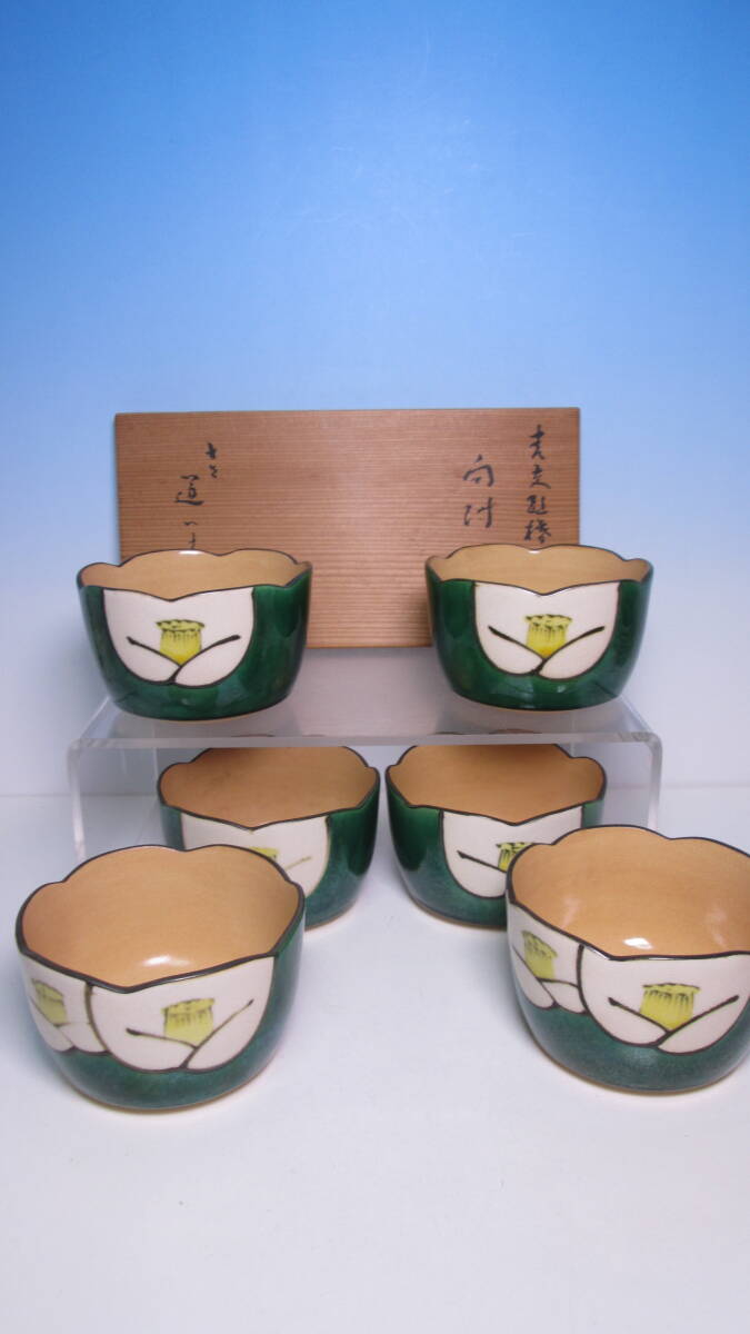- ☆高橋道八 色絵 白椿文 向付 六客 共箱 お料理屋さんの器/懐石/割烹/日本料理