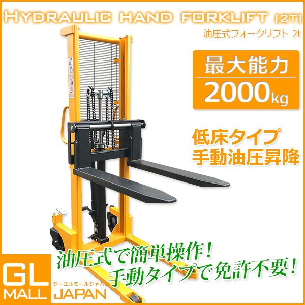 - 1年保証付き ★爪幅調整可能なフォークリフト 2t低床 油圧手動 最大積載2000kg ハンドフォークリフト【パレットチャーター便】