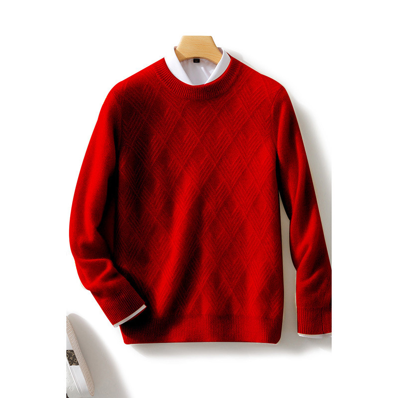 - 人気 カシミヤ 幾何柄 プルオーバーセーター メンズセーター クルーネック ニット 長袖 トップス 赤 M