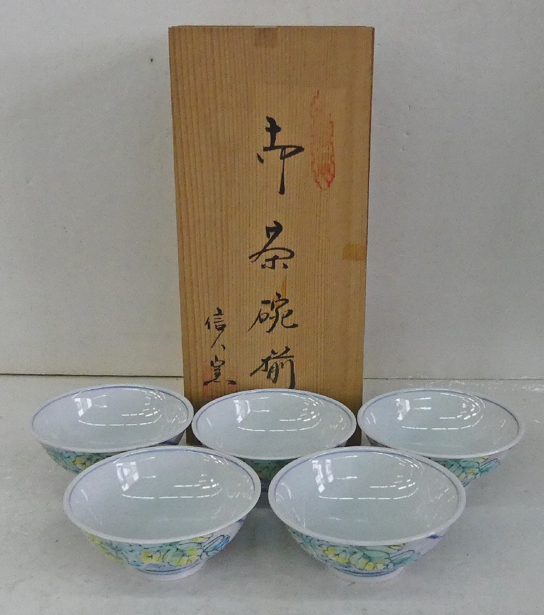 > ☆保管品!有田焼 信人窯 御茶椀揃 絵変わり 茶漬揃 ぶどう柄 和食器 5客セット 木箱付き☆