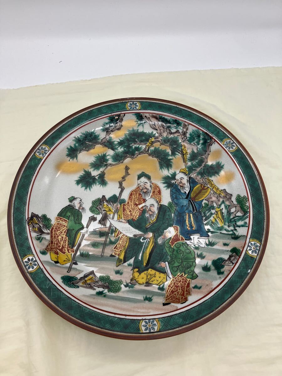 - D80. 時代九谷 色絵 飾皿 31.5cm/古九谷 時代風景図 小紋 大皿 九谷焼 12c/5c/7a
