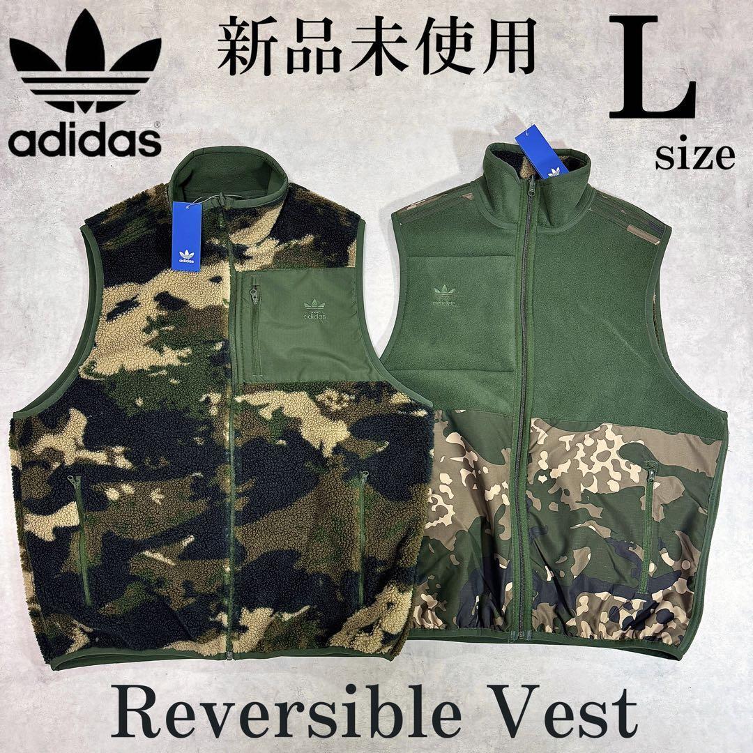 > 新品 Lsize アディダスオリジナルス リバーシブル ボア フリース ベスト 裏表 迷彩 カモ柄 人気柄 グリーン 緑 刺繍 秋 冬 保温 羽織り