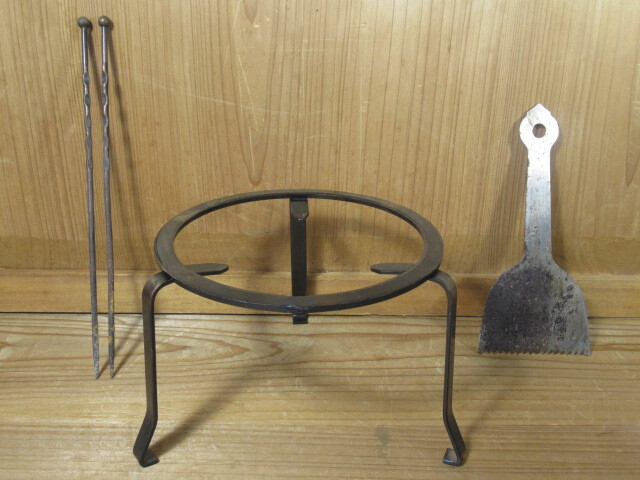- ◆時代囲炉裏道具3点:6:◆三足鉄製五徳◆鉄:持ち手頭宝珠灰掻◆鉄:丸頭よろけ火箸◆鍛冶屋頑丈造◆