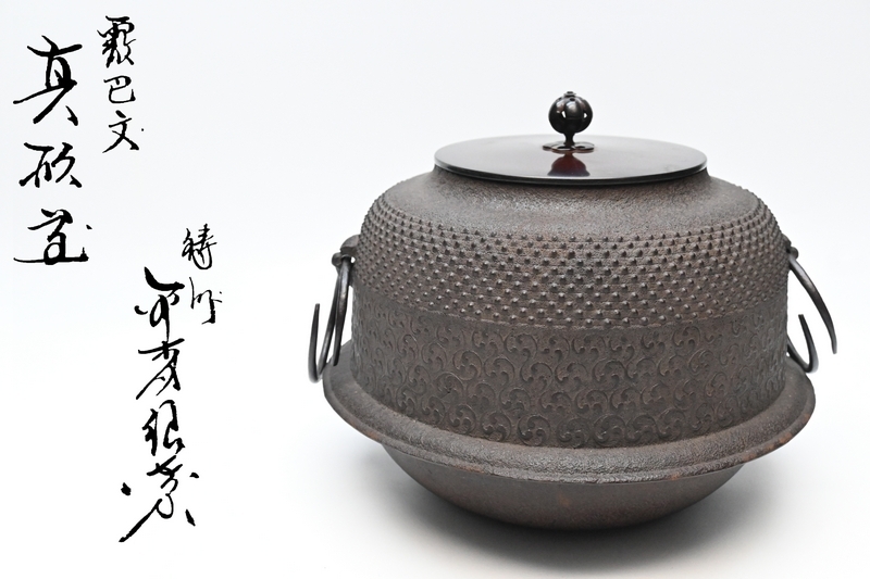 - 鋳師 金森紹栄 ■ 霰巴文真形釜 茶釜 鐶付■ 茶道具 栞 布付き 未使用か 共箱入 外紙箱入り■