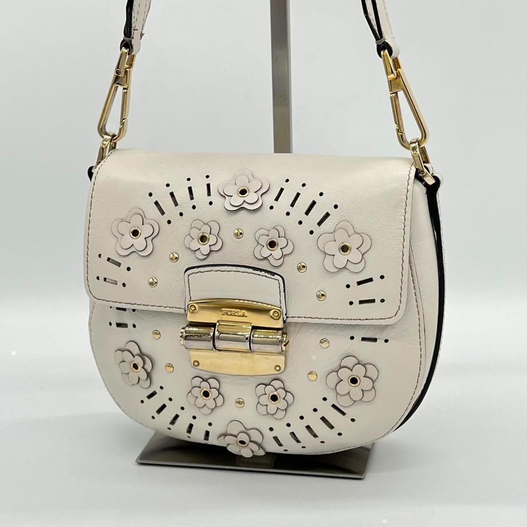 - 【美品】FURLA フルラ クラブミニ フラワーモチーフ ショルダーバッグ 斜めがけ 肩掛け フォーマル レザー レディース クリーム CH200414B