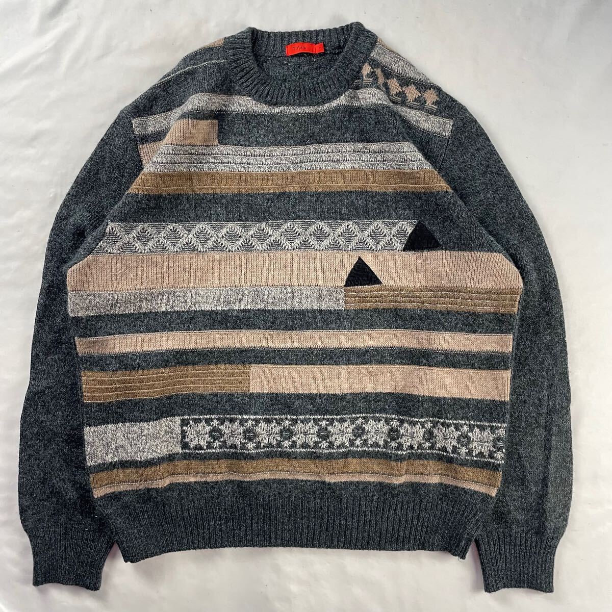 > Euro Vintage TISSAIA くすみカラー スエードレザーパッチ 立体 3D 幾何学模様 アート エスニック 民族 ボーダー メランジ デザインニット