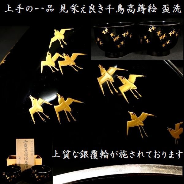 【 恵 #1488 】 上手の一品 銀覆輪 見栄え良き千鳥高蒔絵 盃洗 二客 共箱あり 懐石 金蒔絵 底梨地拍卖