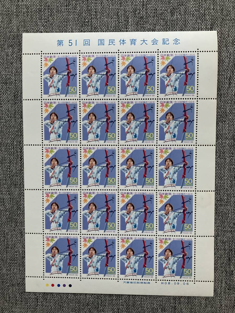 - ★未使用 第51回 国民体育大会記念 広島 国体 アーチェリー もみじ 1996年 平成8年 切手シート 50円 20枚 日本郵便