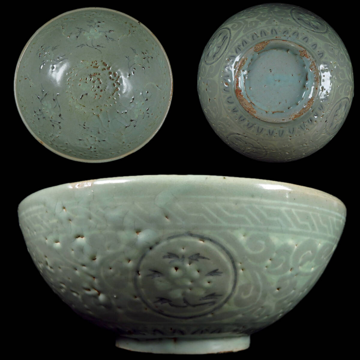 - 【SAKURAYA】コレクター整理品【高麗青磁 茶碗】煎茶道具 茶道具 白黒象嵌 時代物 韓国 骨董品 古美術品 朝鮮古美術 朝鮮古陶磁 直径19cm