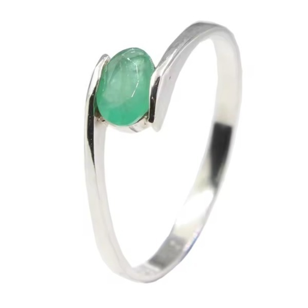 女性用シルバーと天然エメラルドのリング、滑らかなシルバー、4mm x 6mm、0.5ct、925シルバー
