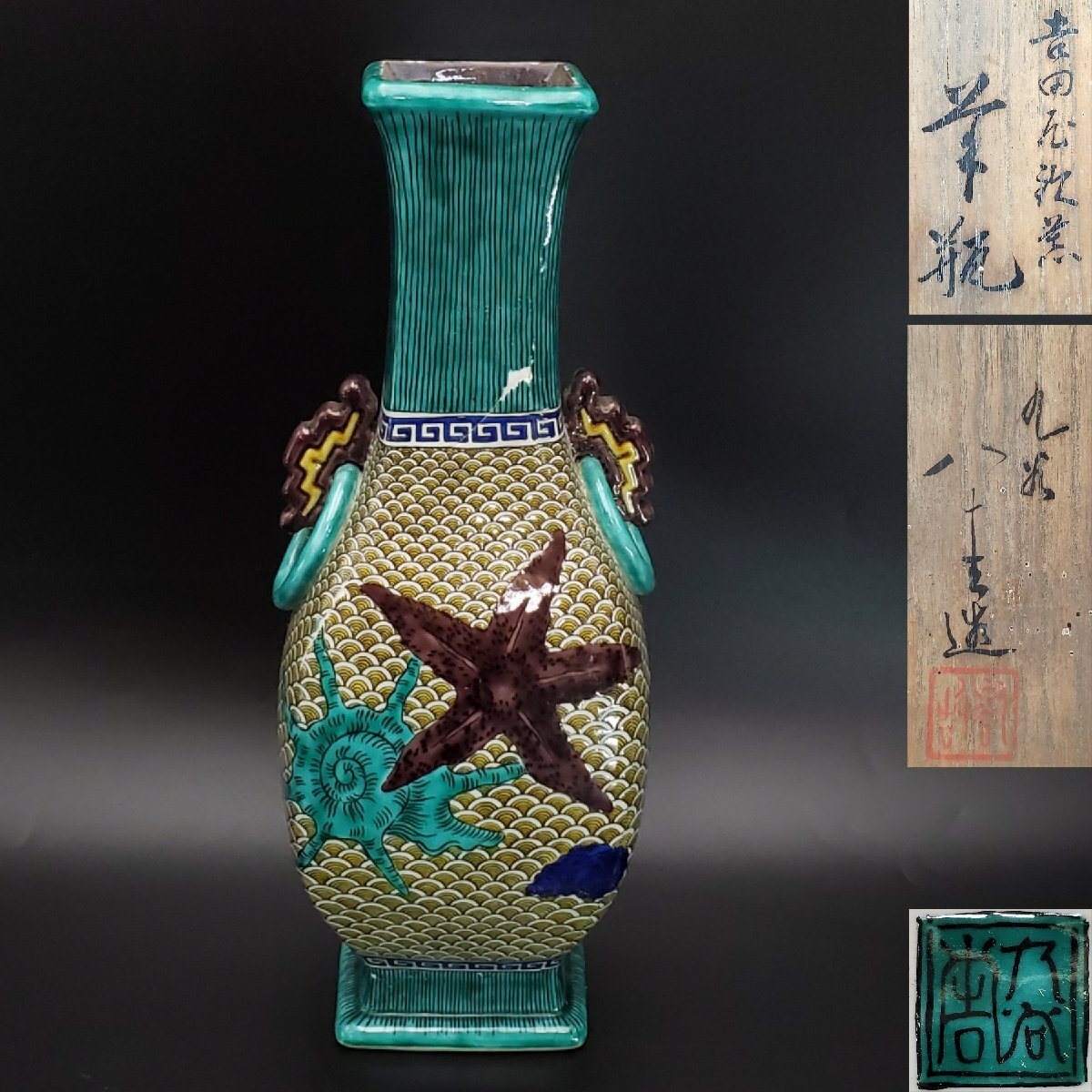 > 【宝蔵】九谷焼 人間国宝 初代 徳田八十吉 吉田屋欽慕 青手九谷 貝図 花瓶 花器 花生 高さ35㎝ 茶道具 華道具 共箱 難あり ジャンク現状品