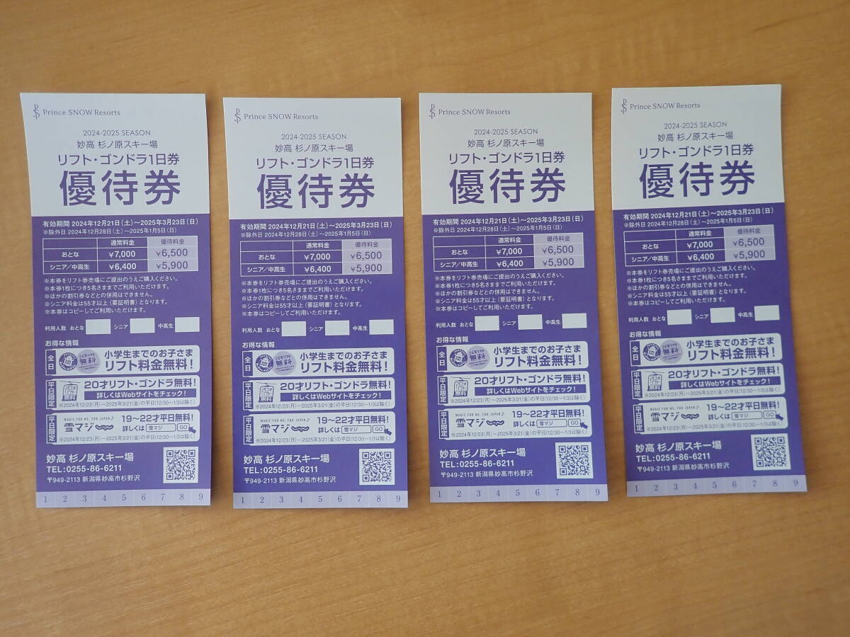 - 【妙高 杉ノ原スキー場】妙高 杉ノ原スキー場 4枚セット 2024-2025 SEASON リフト・ゴンドラ1日券 優待券