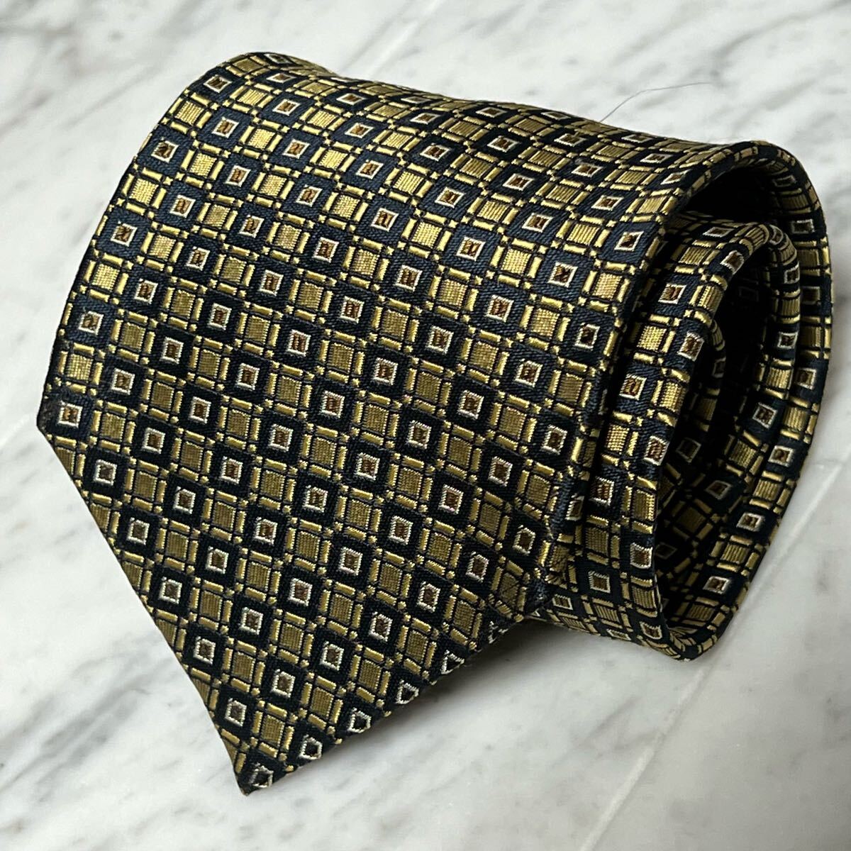 - 999円~ renoma ネクタイ ネイビー ゴールド 小紋 格子柄 総柄 (B7)