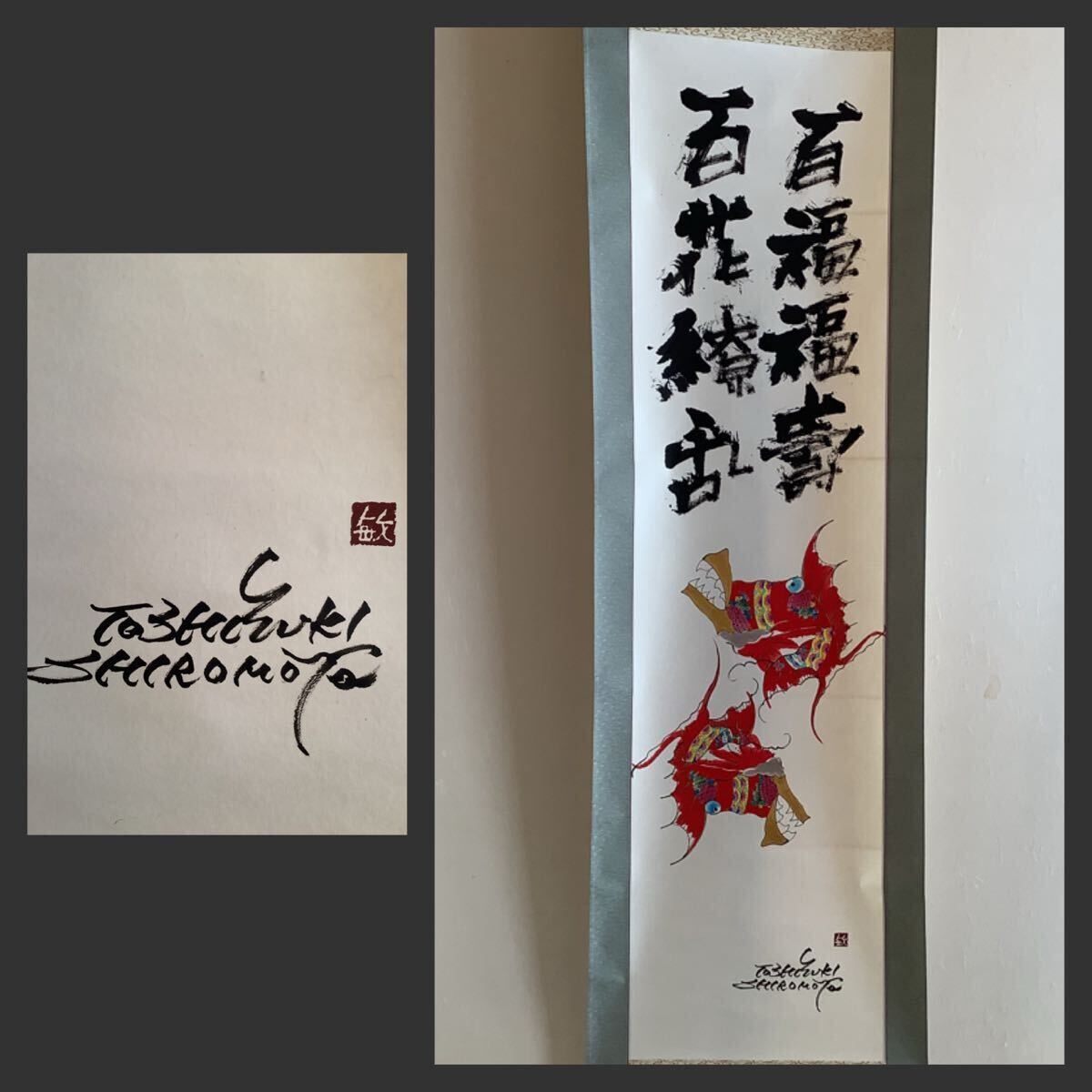 - 【真作】掛軸Ja780[城本敏由樹 エンペラーフィッシュ]彩色紙本 書いたもの/サインあり 百福百寿百花繚乱 印章