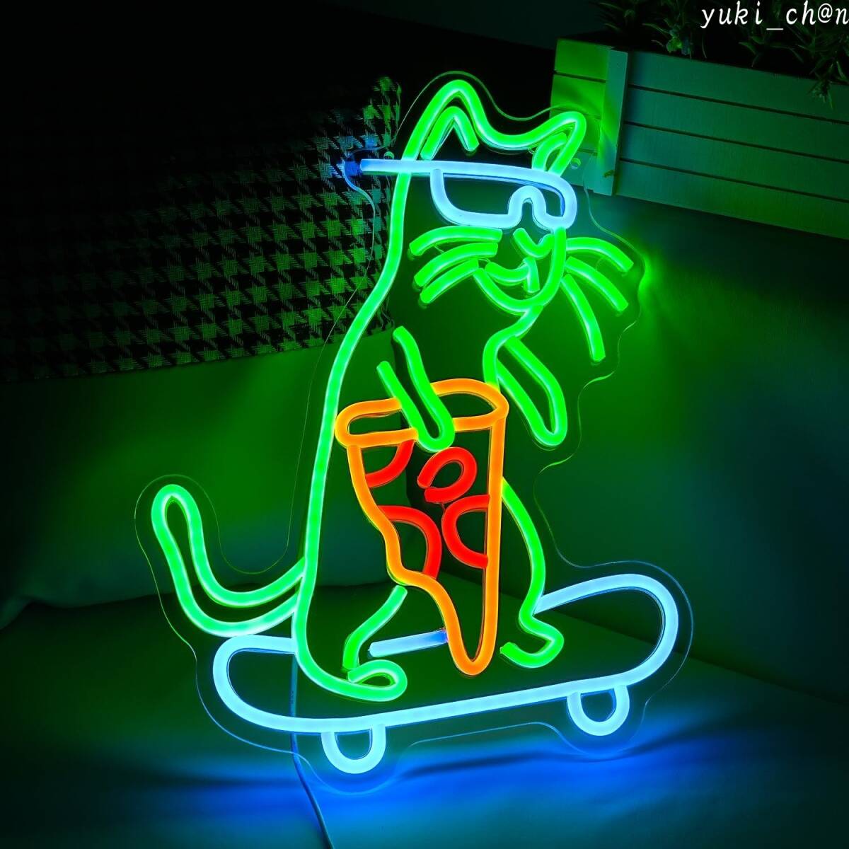 - ネオンサイン スケボー猫 LED クールメガネ 猫ネオン 壁飾りピザネオンライト 調光可能 猫ピザネオン管 ピザ店 レストラン ペットショップ