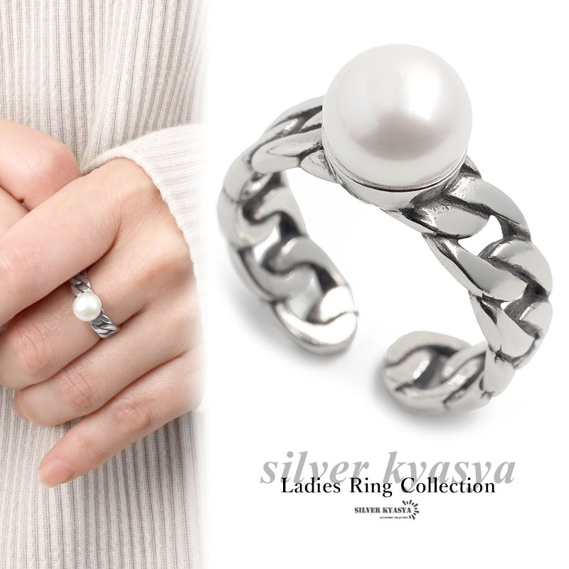 - シルバー925 リング レディース パール 指輪 フリーサイズ チェーンモチーフ 真珠 太め シルバー 金属アレルギー