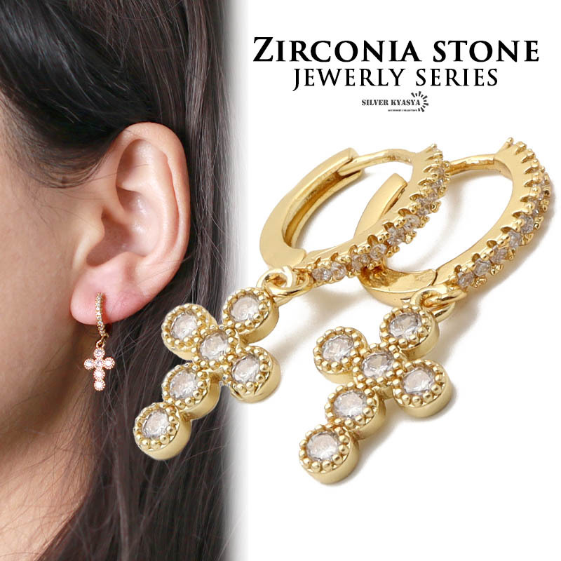 - 両耳用 フープピアス チャーム クロス 十字架 CZ AAA パヴェ 爪留め ゴールド ストーンアクセサリーピアス
