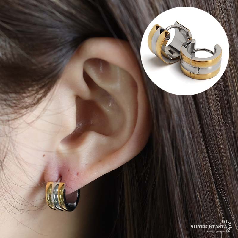 - ステンレス フープピアス 太めピアス ゴールド シルバー バイカラー コンビカラー ワイドピアス 両耳用2点 女性 金アレ対応