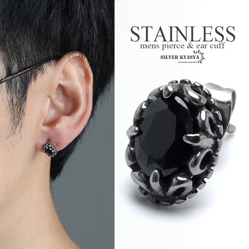 - ステンレス素材 オニキスピアス シルバー 一粒ピアス オニキス オーバル スタッドピアス フレア 金属アレルギーフリー 片耳