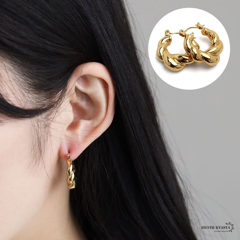 - 安心のステンレス素材 18kgp ワイドピアス ゴールド ツイストピアス 大ぶり ロープピアス ねじりフープピアス 両耳 2点