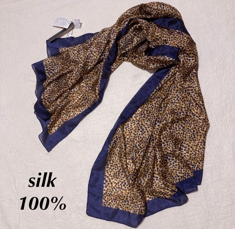 - 新品 タグ付き 定価6825円 ヒョウ柄 大判 スカーフ ストール シルク 100% 112Х186センチ