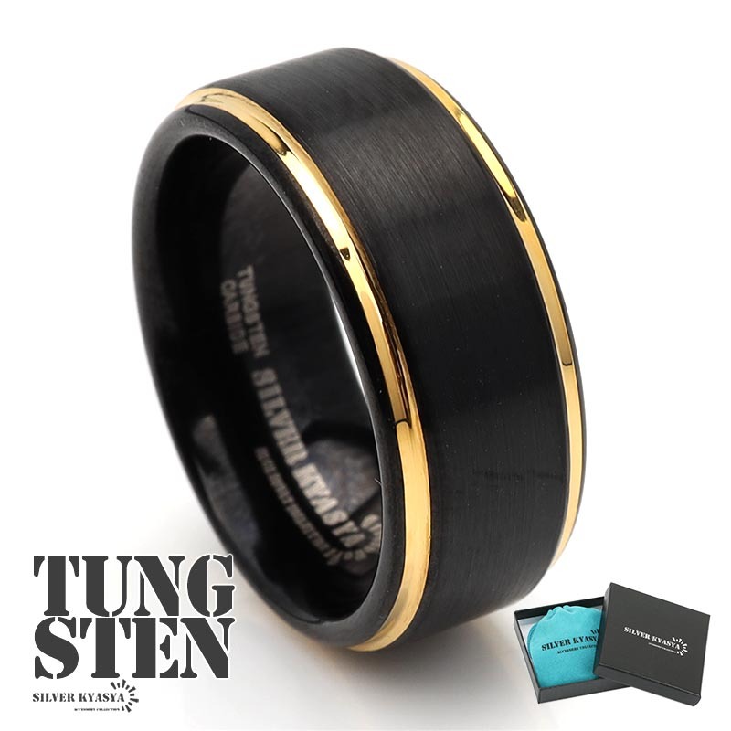 - (14号) 超硬 タングステン リング 指輪 マット 艶消し ブラック 黒 金 ゴールドライン リング BOX付属