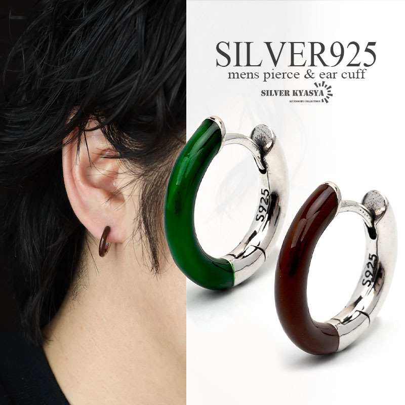- (ブラウン) シルバー925 フープピアス メノウ 天然石 アゲート グリーン 緑 ブラウン 茶色 ツートン 2カラー 片耳用
